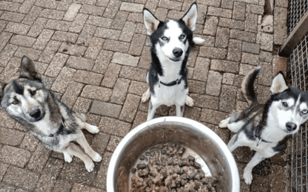 In de beginperiode hadden de honden één ‘vleesdag’ per week. “Dan kregen ze allemaal echt alleen maar vlees, maar dit was toch wel heel veel gedoe en geklieder met zoveel honden. We voeren sowieso twee keer per dag. We maken nu al het voer klaar in een grote emmer. Hier doen we de brokken in en 1 kg vlees en water. Dit mengen we tot een heerlijk papje en dat krijgen ze dus twee keer per dag. Smullen vinden ze het allemaal.” De honden hebben nu een veel betere ontlasting en meer lichaamsvet.
