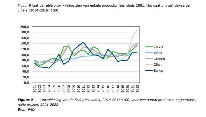 Figuur 9 laat zien dat de voedselprijzen – na de dalingen van de vorige hoge pieken in de wereldmarktprijzen in 2007-2008 en 2010-2011 – sinds de zomer van 2020 weer aan het stijgen zijn. De prijsstijgingen zijn onder meer het gevolg van verstoringen in de handel vanwege COVID-19 en specifieke oorzaken per product. Dat maakt het zo lastig om de prijzen stabiel te houden. De prijzen van vandaag kunnen morgen weer totaal anders zijn.