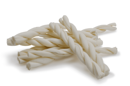 Farm Food Rawhide is gedroogd onderhuids bindweefsel (de tweede, stevige en taaie, laag) van de huid van runderen. Onze witte kauwkluiven komen uit Europa en zijn gemaakt van de huiden van vrije‑ uitloop runderen die daar voor de vleesproductie worden gehouden.Het productiebedrijf is een onderdeel van een grote slachterij, de huiden worden daarom direct na het slachten machinaal gespleten. De buitenste, onverteerbare, lederhuid wordt daarbij verwijderd voor de leerproductie. De binnenste lagen, verteerbare, onderhuids-bindweefsel worden gewassen en op de gewenste maat in stukken gesneden. Na handmatig in de verschillende vormen te zijn gevouwen, worden de witte kauwkluiven enkele dagen in een oven gedroogd. Een zeer belangrijk aspect van onze producten is dat er, door deze snelle verwerking, tijdens de gehele productie geen schadelijke stoffen worden gebruikt. Daardoor kunnen wij een schoon, zuiver en veilig product garanderen.